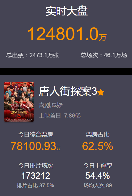 春节档首日,《唐探3》凭借此前预售超10亿的成绩强势领先,上映11小时票房就狂砍7.8亿多,成为这个春节档当之无愧的焦点,62.5%的票房占比更是强势屠榜,1打6没有任何压力。