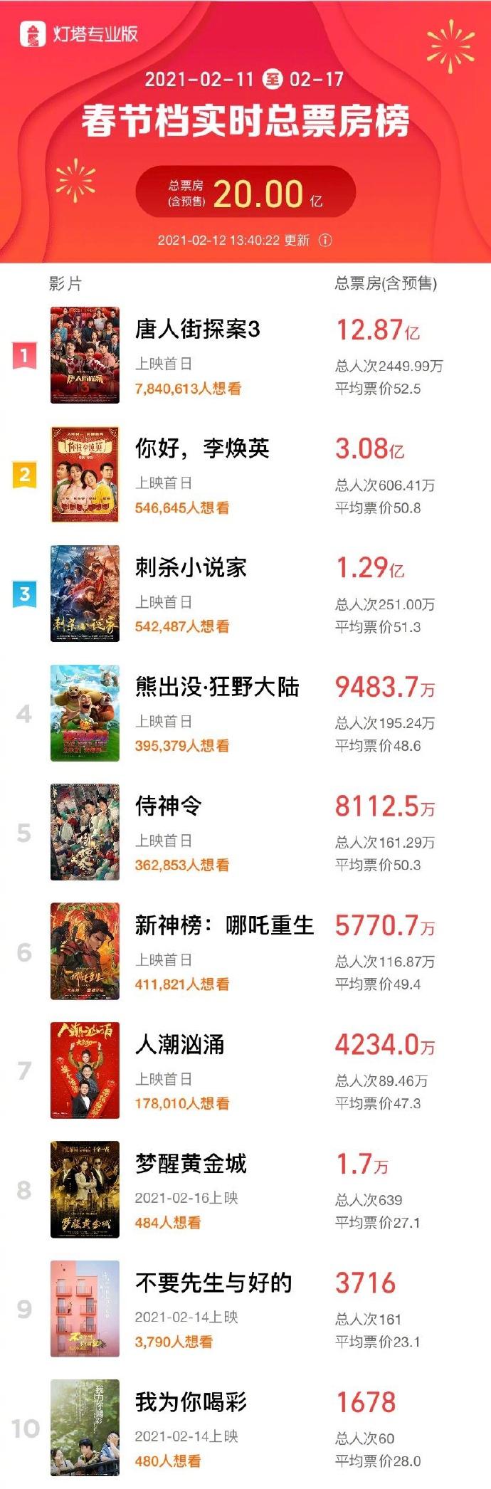 序言:截止到2021年2月12日下昼1点40分,2021春节档期内(2月11-2月17日)总票房(含预售)破20亿元。《唐人街探案3》以12.87亿高居春节档总票房冠军,《你好,李焕英》超3亿排在第二,《刺杀小说家》超1.29亿排在第三。
