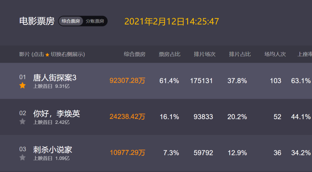 从其他数据来看,《唐探3》也是全方位碾压同期上映的电影,该片以将近4成(37.8%)的排片占比,拿到了6成(61.4%)的票房,票房表现相当强势。