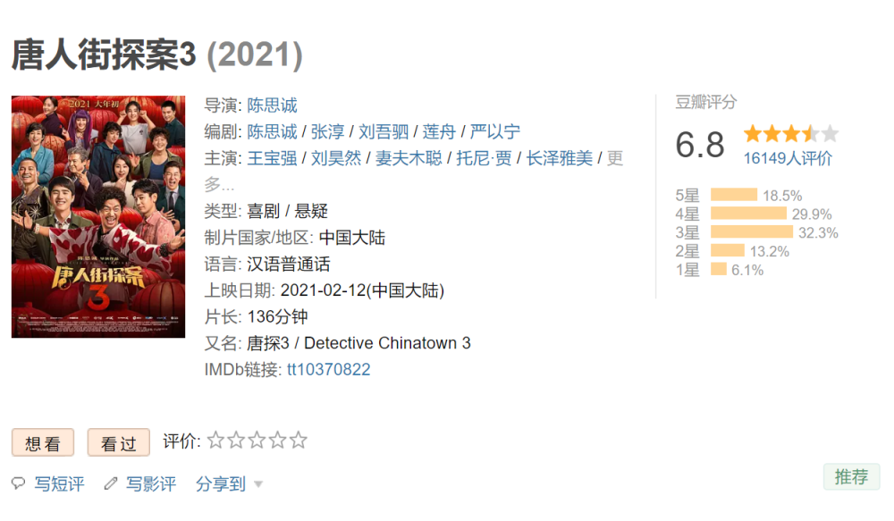 就在2月12日《唐探3》首映当天,该片的首波评分也出炉了,目前该片综合评分6.8,三星以下包含三星的评分占了百分之50以上,因而可知该片口碑很一般。