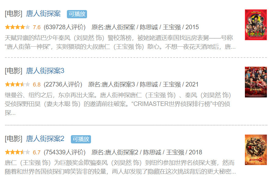 值得一提的是,《唐探》系列前两部作品,评分分别为7.6和6.7分,呈降落趋势,原本以为这部精心制作的《唐探3》能够口碑崛起,至少拿到8分以上的高评分,但是如今却只有6.8分,和预期中的评分口碑有不小差距。