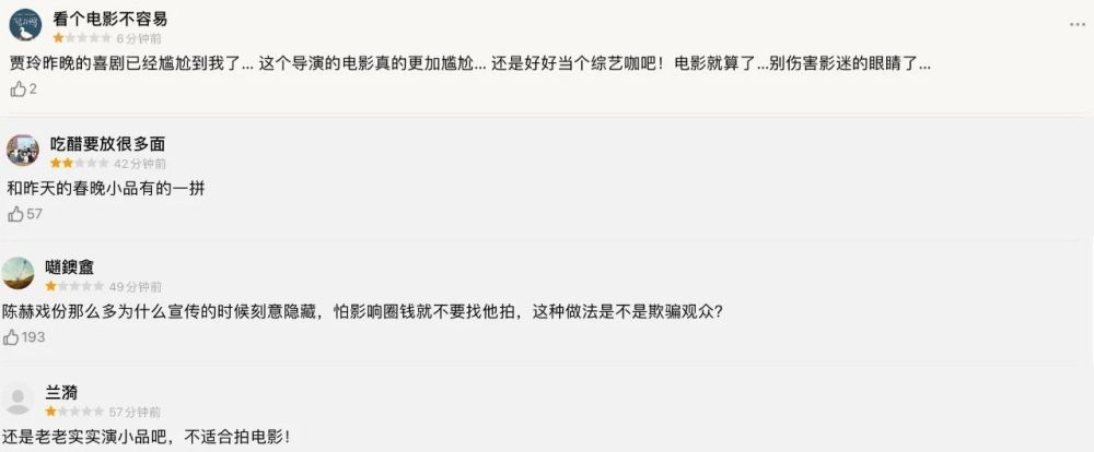 有观众把这部电影和春晚的小品比较,小品演员贾玲和电影导演兼演员贾玲是同一个人,但差别的观众对她的态度纷歧样。小品让人失望,电影也会让人提不起兴趣,甚至看完电影后,部分观众还会进一步吐槽小品和贾玲。
