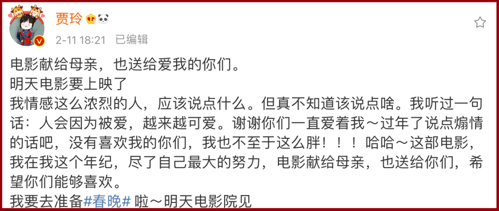 大年三十的晚上,贾玲在社交媒体上持续地为自己第二天上映的电影做宣传。她说:人会因为被爱,越来越可爱。谢谢你们一向爱着我~我在我这个年纪,尽了自己最大的努力,电影献给母亲,也送给你们,希望你们能够喜欢。