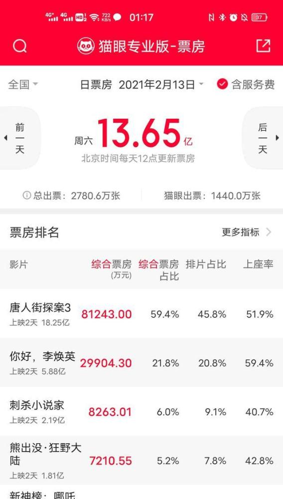 吴京主演的电影《战狼二》的总票房为56.7亿元。不出意外的话,《唐人街探案三》将在正月中完成对《战狼二》这部里程碑电影的超越,独占中国电影排行榜榜首。