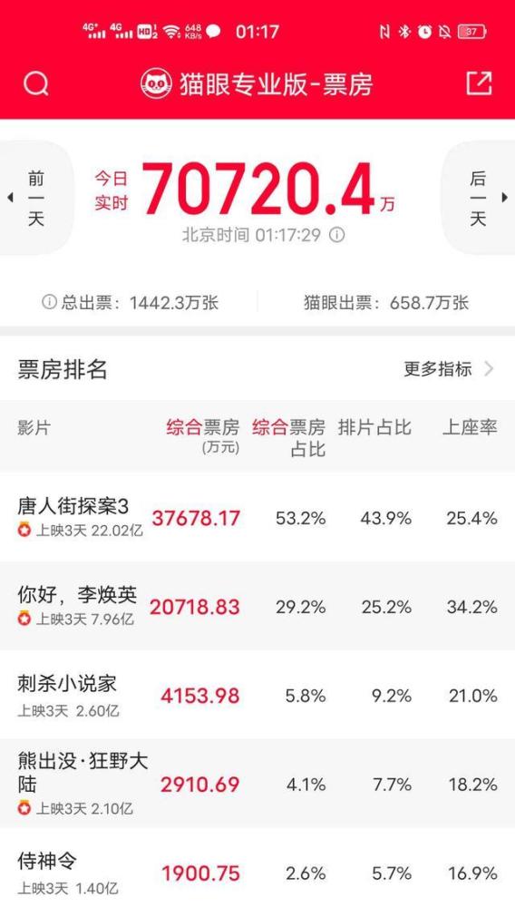 而根据大年初三的预售情况来看,《唐人街探案三》的票房已经超过3亿7千万元,预计全天票房能达到7亿元以上。