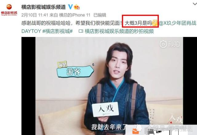 肖战的年后行程是拍摄新的电视剧,在电视剧《斗罗大陆》的专访播出后,肖战在那段专访结尾祝福横店影视越来越好。随后横店官方发布了一条动态,隔空喊话肖战“感谢肖战哥的祝福,希望我们很快能见面!大概是3月吗?”并且还艾特了肖战。看来肖战在年后的行程就是进组拍摄新剧了!