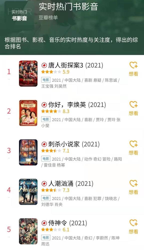 据红星新闻,电影《你好!李焕英》上映以来豆瓣评分8.3分,在春节档上映影片中评分最高,该片有笑点有泪点,受到观众的好评。该片虽然与春节档第一位《唐人街探案3》的票房有必然差距,但业内人士表示,《你好!李焕英》后劲十足,有望凭良好的口碑逆袭。