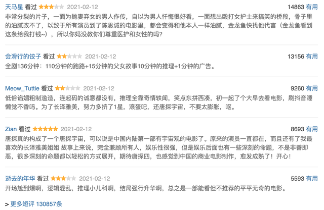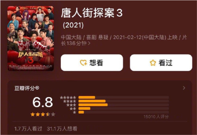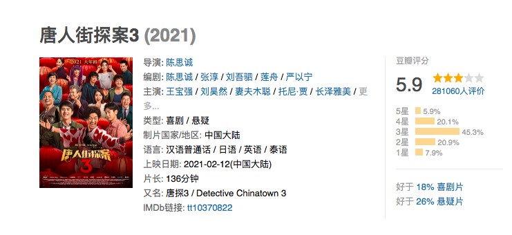 在某权威电影评分平台,《唐探3》评分从6.8一起跌到了5.9。不过即便在这样的情况之下,《唐探3》的票房还是一起飙升,似丝毫没有受到负面评价的影响。