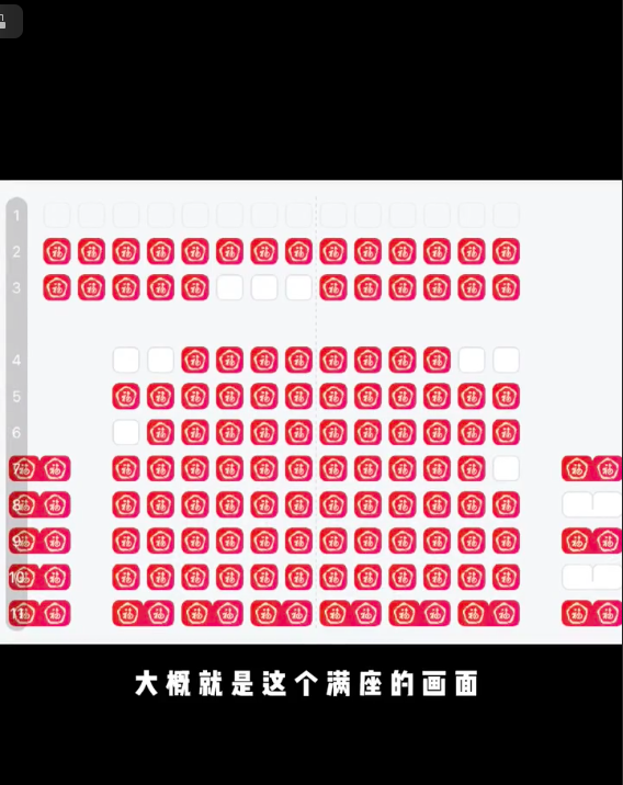 结果到了大年初一,该网红的老公又重新看了一下同一场次的座位图,发现中间座位竟然几乎都空了出来。和大年三十看到的满场飘红的状况完全不一样。