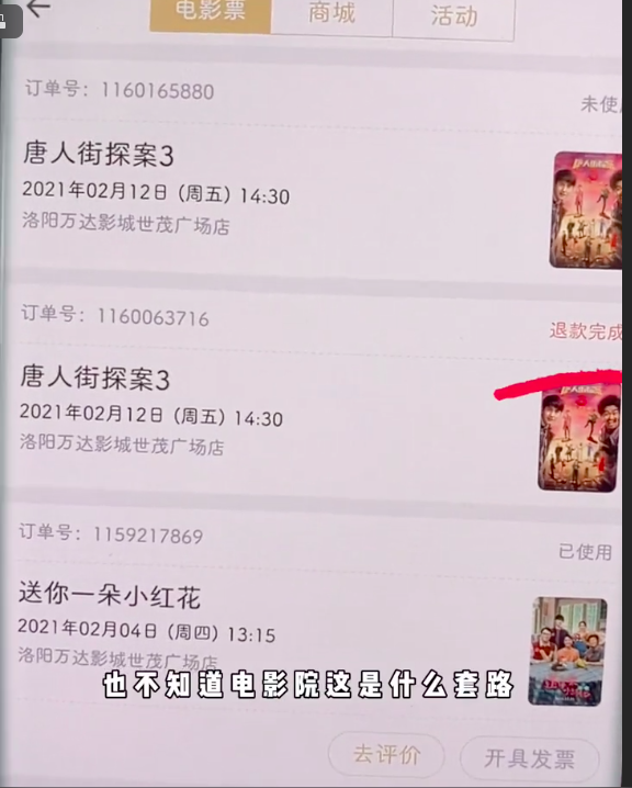 最后该女网红退掉了之前买的边角座位的票,换成了中间座位。为了佐证自己的言论,她还在视频中展示了自己的退票记录。该网红表示:“不知道电影院玩的是什么套路,如果没有购买记录,我还以为我瞎了。”