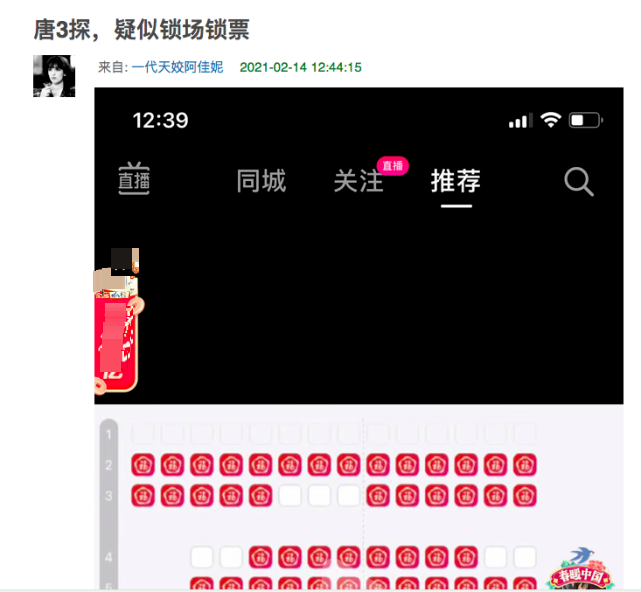 2月14日,有网友就这位女网红的言论在某论坛发帖称:“唐3探,疑似锁场锁票。”其实热门电影锁票在业内已经是公开的秘密,片方及院线为了盈利最大化会若无其事地使用一些“小手段”来制造饥饿营销。