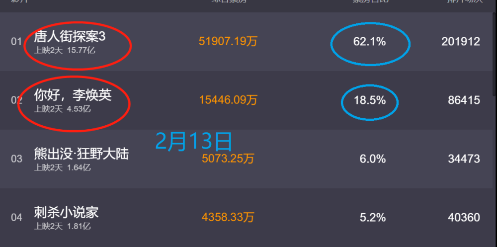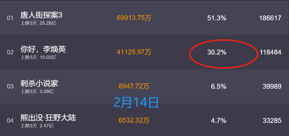 最近这两天《你好,李焕英》这部电影评分在不竭增长,这也促进这部电影的票房增长的非常迅速。2月13日,《你好,李焕英》的票房占比仅为18%(下图),2月14日,这部电影的票房占比涨到了30%(上图),增幅达60%左右。同时,《唐人街探案3》的票房占比从60%降落到51%。