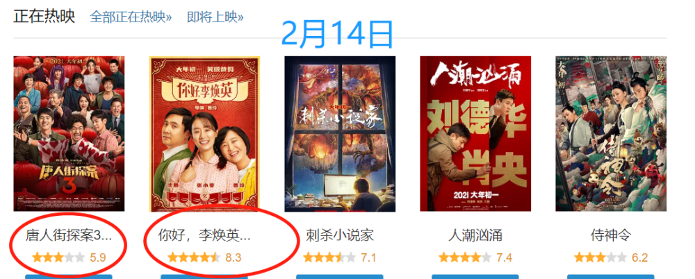 2017春节档上映了多部影片,最受关注的就是《你好,李焕英》和《唐人街探案3》。截至2月14日晚上9点15分,《唐人街探案3》的票房超过了25亿,《你好,李焕英》的票房超过10亿。