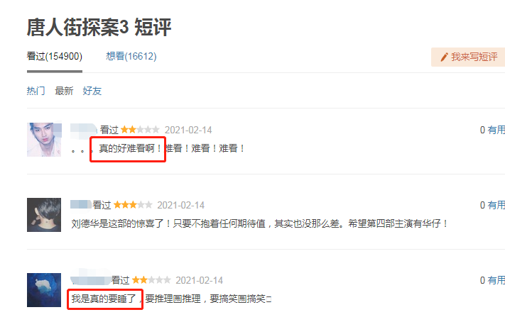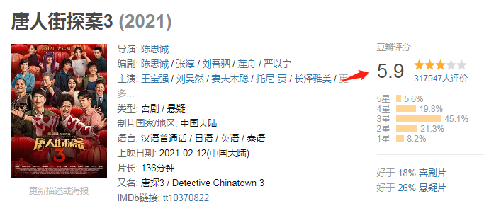 本来想去看贾玲执导并主演的《你好,李焕英》,但硬是被好友拉去看来《唐探3》。观影过后,非常失望,觉得非常不值得票价。甚至感觉是第一次被春节档电影恶心到,与此前看过的《澳门风云3》相比有过之而无不及,都是一样的烂,但《澳门风云3》至少还能让人笑一笑,而《唐探3》,几乎是一无可取。
