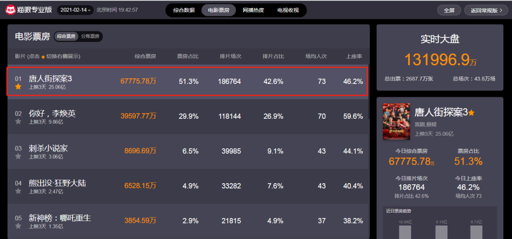 在截至目前发文时间,从“猫眼专业版”实时票房数据显示,该片目前以上映3天时间,累计总票房破25亿,单日综合票房6.7亿,票房占比51.3%,排片场次18.6万余场,排片占比42.6%,场均人次73人,上座率46.2%的数据连续三天领跑票房榜。