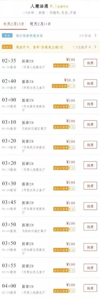 记者注意到,有网友截图了身边的电影院排片情况,惊讶地发现,《人潮汹涌》的不少排片在凌晨午夜场,比如从凌晨1点场-5点的场次,而且票价也很离谱,甚至还有200多元一张的,观众大概率不会大半夜爬起来去影院看片,那就肯定没有上座率,因此有网友表示,这样的话就会直接拉低上座率,这样的数据给到影院后的直接后果就是后续不排了。