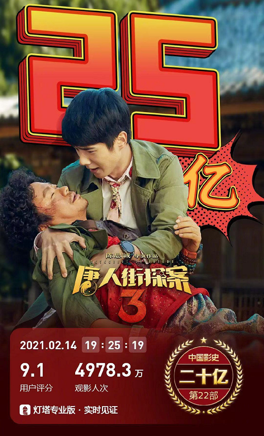 今年的春节档电影堪称激烈厮杀,几部电影都是口碑大制作。陈思诚 《唐人街探案3》,贾玲的《你好,李焕英》,还有雷佳音董子健主演的《刺杀小说家》,以及刘德华 的《人潮汹涌》等等。在几部电影中,口碑最高的是贾玲为母亲拍的《你好,李焕英》,但票房一骑绝尘的,却是《唐人街探案3》。