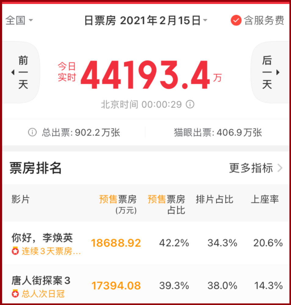 大年初四,春节档进入第4天,一向以高排片、高票房稳居榜单第一位的《唐人街探案3》开始出现颓势,排片率降到了38.0%,目前的预售票房为1.74亿,跌至第二名。