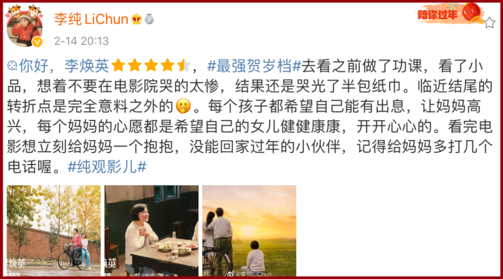知名演员李纯在看完《你好,李焕英》之后写到:
