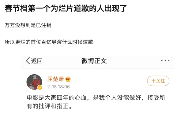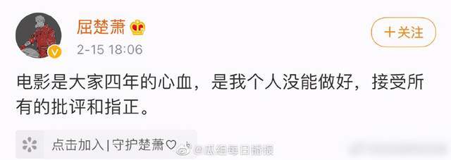 主演屈楚萧也在15日晚,发文道歉,屈楚萧表示:电影是大家四年的心血,是我小我没能做好,接受所有的批评和指正。