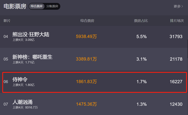 截止目前,《侍神令》上映4天累计票房才1.8亿元。远远被《熊出没》、《哪吒》等电影甩在身后。