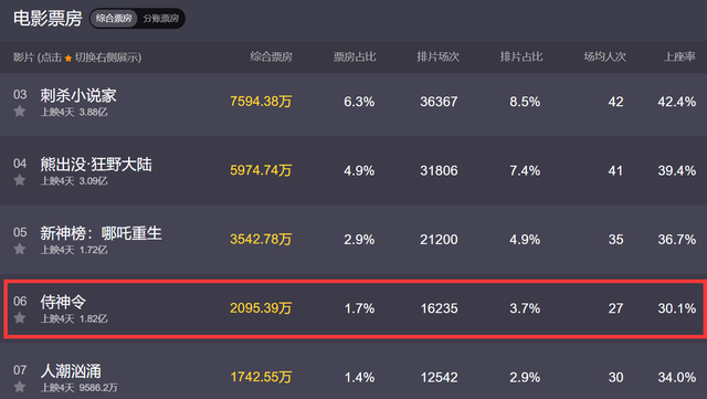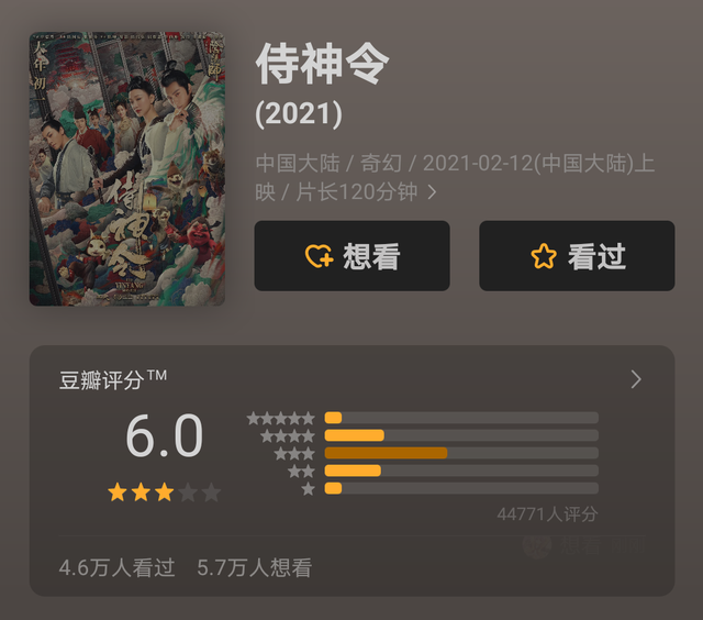 但相比其他春节档电影就比较惨了,就《刺杀小说家》还行,但口碑也是南北极分化,《哪吒重生》虽然票房不高,但也算稳定,而《人潮汹涌》尽管垫底,可口碑评分也是仅次于《你好,李焕英》之后的第二部电影,《熊出没之狂野大陆》作为儿童片,不再范围内,所以,只有《侍神令》是最尴尬的存在。