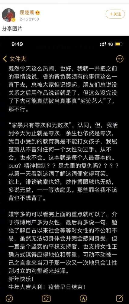 在早期凭借《流浪地球》大火后,本来以为会往实力派演员的道路发展,但后来被媒体拍到恋情,但自己却矢口否认,而女方的回应则是才知道自己是被分手的,由于二人口语纷歧致,所以,屈楚萧也被贴上了渣男的标签,后来,又有家暴传闻曝光,但在昨天晚上,屈楚萧突然对于所谓的家暴传闻进行澄清,否认了事实,虽然句句有理,但这个时候突然回应,看来是为了给电影抢最后的热度。