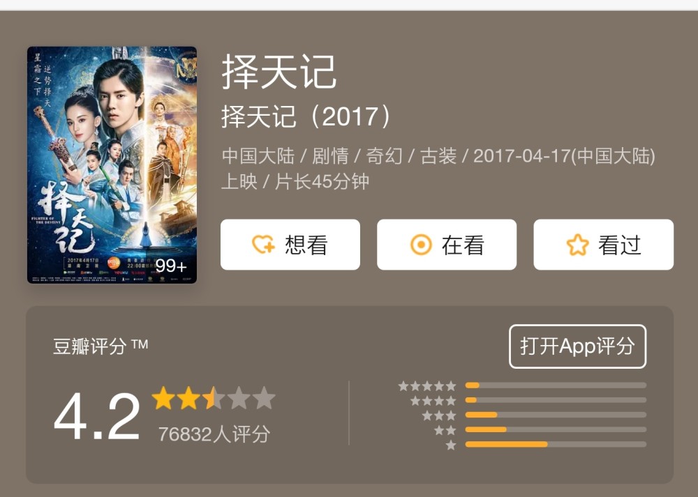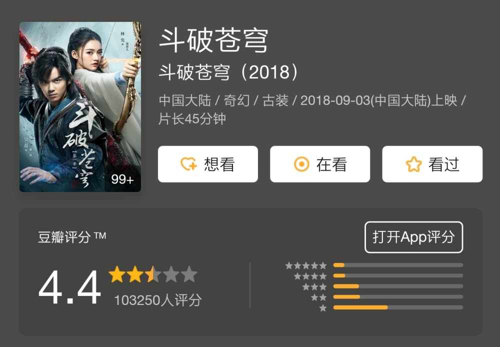 但这都是在《择天记》扑街以后,《择天记》是部怎样的作品?一样是一部知名度很高的小说,至少比什么《将夜》、《庆余年》的知名度更高,而当初饰演陈长生的更是顶级人气流量明星鹿晗,然而《择天记》却扑街了,你只知道斗气化马但你未必知道《择天记》的豆瓣评分比《斗破苍穹》还要低。