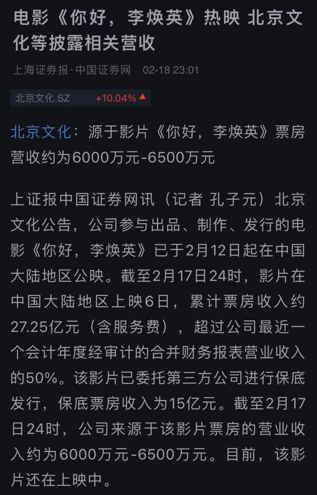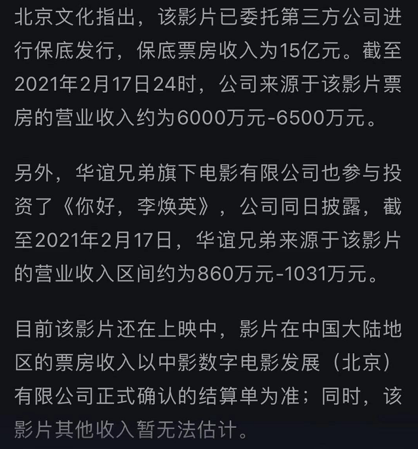 从两家公司披露的数据可以看出,截止到2月17日,《你好,李焕英》的票房27.26亿,此时北京文化来源于该影片的票房营业收入约为6000万-6500万。