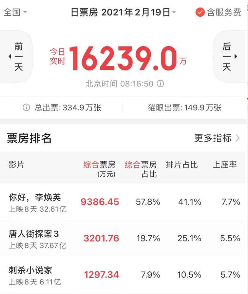 2月19日,电影《你好,李焕英》上映第八天,票房已经超过32亿,单日票房远超排名第二的《唐人街探案3》,按照这个趋势,用不了多久总票房就能反超,成为春节档最大赢家,而某票务平台给出的预测票房也达到了51.82亿。