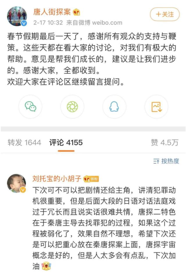 官方微博发文表示,感谢观众的支持与鞭策,愿意接受大家的意见,希望《唐人街探案4》能够吸取这些意见,有成长与进步。