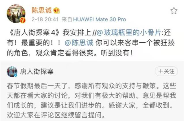 2月18日晚,导演陈思诚转发了官微的发文,并回复其中一位网友,幽默表示接受网友的建议,在《唐人街探案4》里面,客串一个被狂揍的角色,让观众发泄一下。