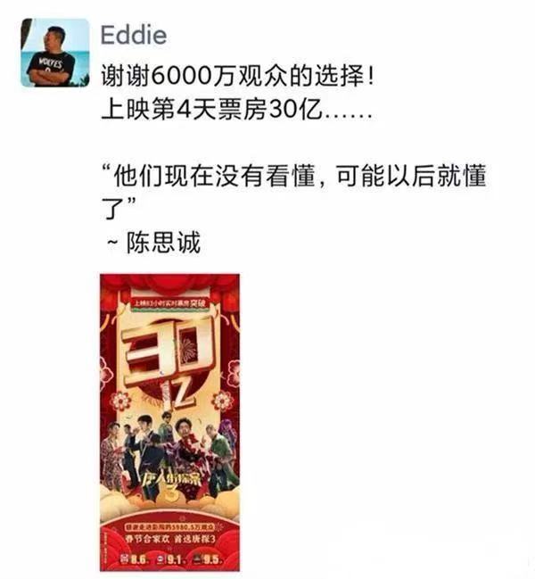 经纪人认为,《唐人街探案3》能够破30亿元是非常成功的,并引述了陈思诚的话“他们现在没有看懂,可能以后就懂了”。