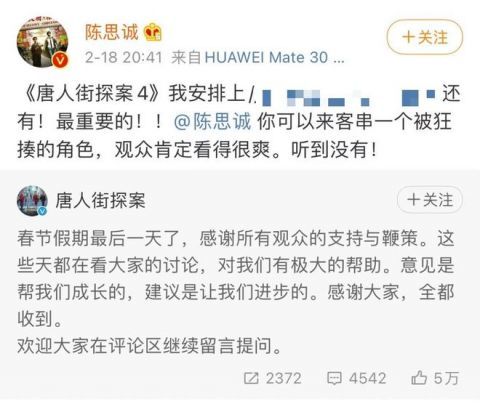 18日晚,陈思诚转发这位网友的评论,回复道:“《唐人街探案4》我安排上”。