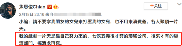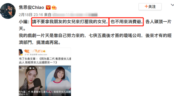 2月18日,焦恩俊深夜发文怒怼营销号,该营销号16日发布了一篇名为《同为星二代 焦恩俊女儿查无此人 陈昭荣女儿出道即女一?》的文章,在文中一向赞赏陈昭荣女儿,却贬低焦曼婷。对此,焦恩俊直言请不要拿他朋友的女儿来打压他女儿,也不要消费他。