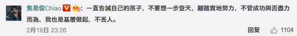 除此以外,焦恩俊还说道“一向告诫孩子,不要想一步登天,踏踏实实努力,不管成功与否尽力而为”。