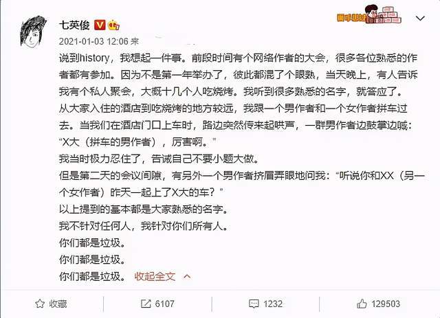 在这条动态上,七英俊并没有提到任何男作者,也没有指名道姓是谁,但她向所有男性喊话:“我不针对任何人,我针对所有人,你们都是垃圾。”