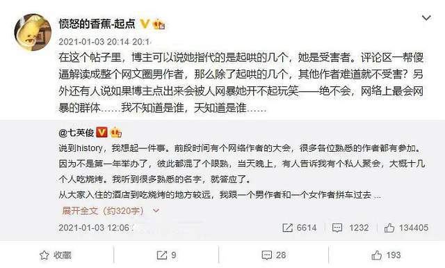 事情最开始是因为《赘婿》原作者愤怒的香蕉和女作者七英俊的讨论,在某一次网络作者大会之后,七英俊在网络上曝光了自己受到“性骚扰”的事情。