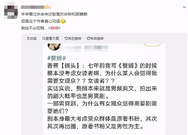 另一部网友觉得,既然原作者觉得男频文不需要女性观众,那么电视剧是否是也不需要女性观众,因此抵制不看该剧。