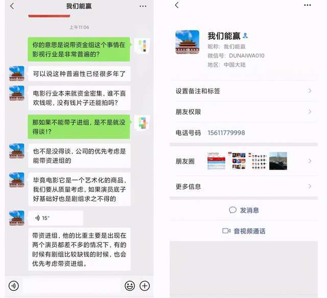 在与该负责人的微信聊天中,她毫不避讳的直说带字进组,是演员实力的一个表现。同样是两个品质相当的演员,剧组肯定会考虑能带资进组的,尤其是在疫情期间剧组遭遇撤资情况严重,如果有资金进入,将大大的增加该演员的筹码。