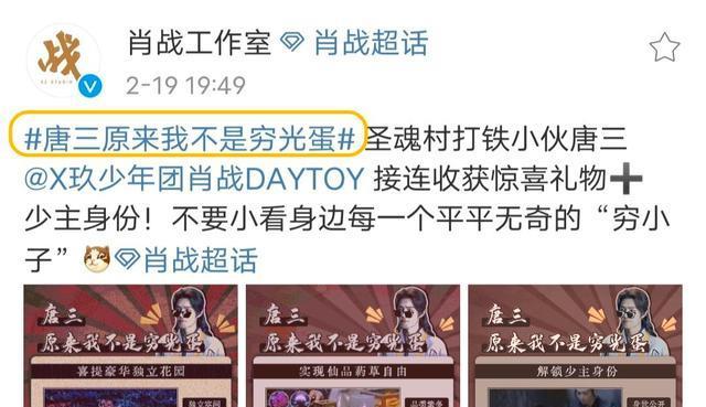 肖战工作室最新更文是,“『唐三原来我不是穷光蛋』圣魂村打铁小伙唐三接连收获惊喜礼物少主身份!不要小看身边每一个平平无奇的“穷小子”。”还配上了三张剧情动图,进一步为唐三原来不是穷光蛋进行充分论证。