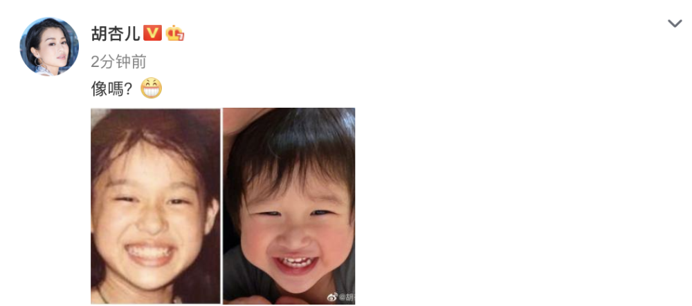 2月22日晚上,胡杏儿在社交平台分享了自己和小儿子的童年对比照,并问网友们觉得他们长得像不像。