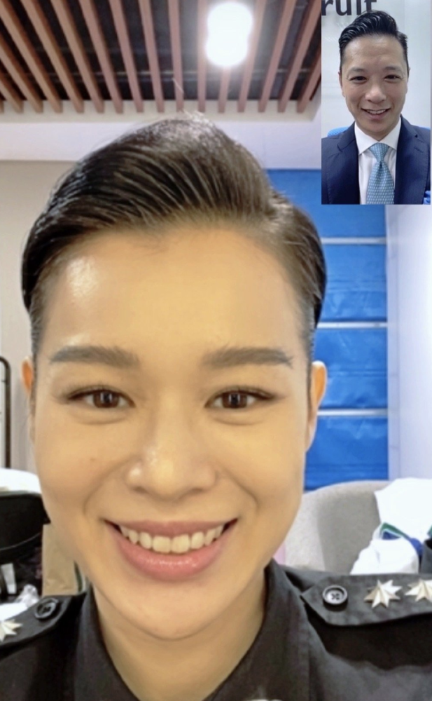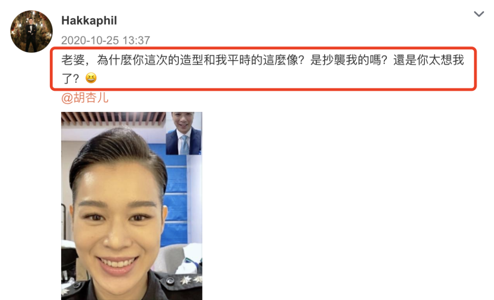 此前,胡杏儿在参加《演员请就位》的时候,饰演过一次警官,也是输了个三七分的大背头,不小心和老公撞造型了,李乘德晒出视频聊天时候的截图,并调侃称:是抄袭我的吗?还是你太想我了?简直甜炸了。