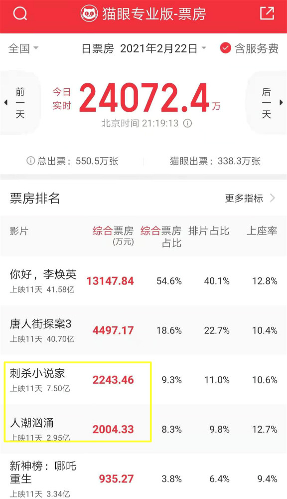 2月22日,《人潮汹涌》日票房急剧逼近《刺杀小说家》,日票房第3名就在眼前了。