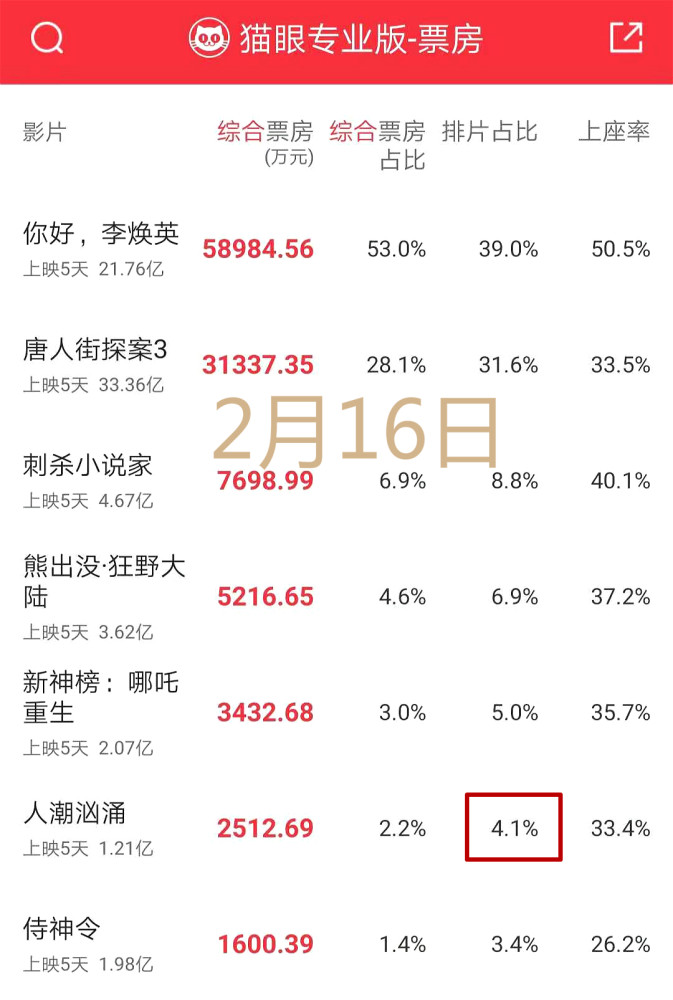 排片上涨票房自然也上来了,《人潮汹涌》2月16日当天,凭借4.1%的排片日票房击败《侍神令》,跃升为春节档第6名!