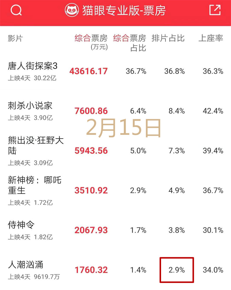 2月15日,春节档第4天,《人潮汹涌》降到了最低——2.9%!