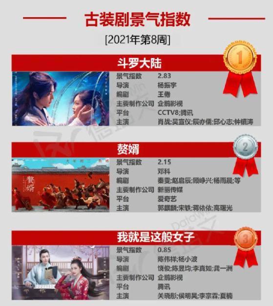 过去一周电视剧市场上最火热的类型剧还是古装剧,寒假档有多达8部古装剧播出,景气度最高的就是《斗罗大陆》和《赘婿》两大男频大IP改编剧,并展开了激烈的角逐。两剧景气指数纷纷突破2,这在过去也是少有的现象。