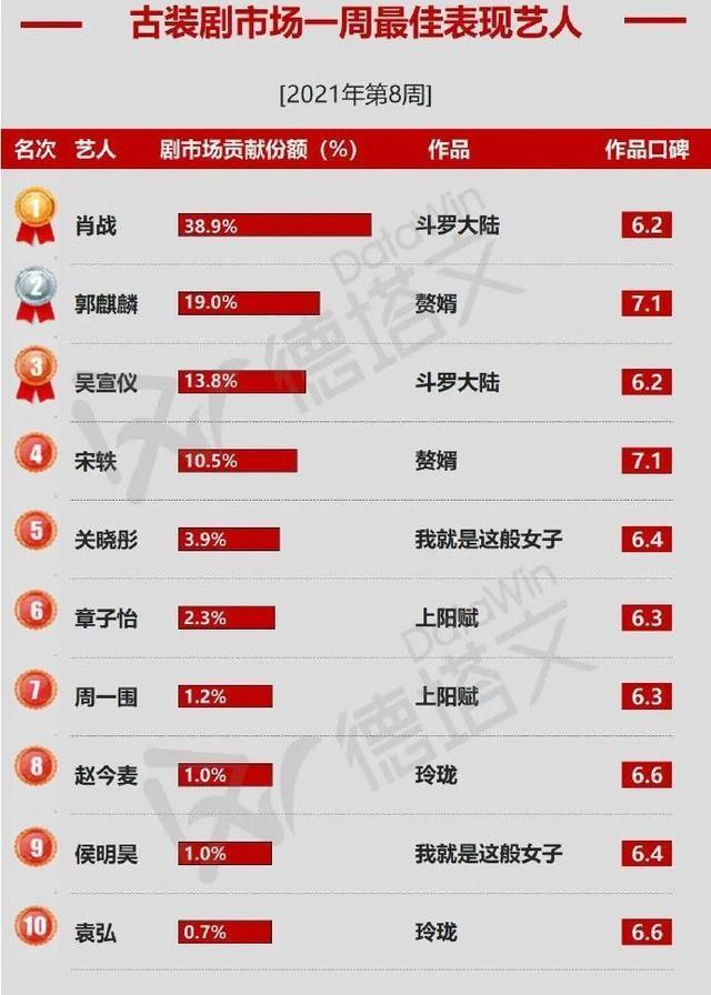 古装剧市场表现最佳的艺人是肖战,剧市场贡献份额达到38.9%,近4成,几近两倍领先于排在第二的郭麒麟 。此外,两大男主各自的剧中CP纷纷进入前4。