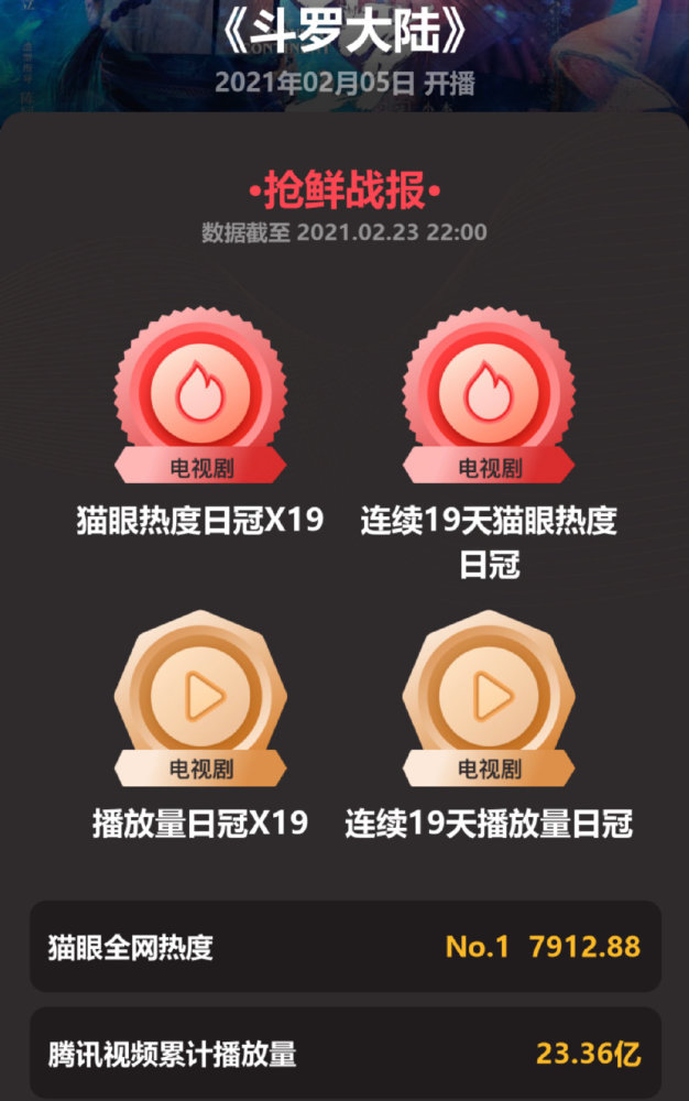 刷新纪录!《斗罗大陆》单天播放量破2亿!高达2.11亿!肖战 连续18天破9蝉联登顶V榜电视剧演员TOP1!#斗罗大陆成为2021唯逐一部指数破3的电视剧!不竭刷新纪录!开播以来蝉联多榜单日周榜连冠[赞]这成绩太能打了!