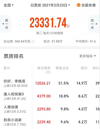 到了2月23日,《人潮汹涌》上映的第12天,该片再收票房2293.8万,超过了视效大片《刺杀小说家》(2239.4万),成为当日日票房季军,这次日票房的超越还是在排片低于《刺杀小说家》的情况下。
